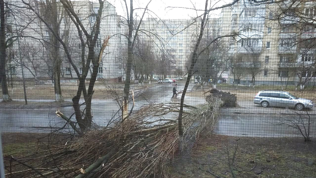 У Києві на перехресті вулиць Дегтярівської і Шевцова вітер повалив дерево на велосипедиста, який отримав тяжкі травми. За попередньою інформацією, у нього переломи обох ніг. У багатьох місцях постраждалі рекламні щити та передвиборчі намети.