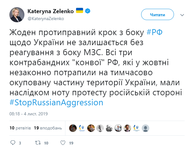 За жовтень 2019 року Міністерство закордонних справ України направило Росії три ноти протесту з приводу незаконного вторгнення так званих "гуманітарних конвоїв" на тимчасово непідконтрольну Києву територію Донбасу, написала прес-секретар МЗС України Катерина Зеленко Twitter.