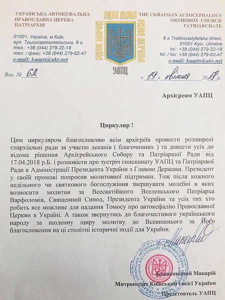 Митрополит київський і всієї України, предстоятель Української автокефальної православної церкви Макарій видав циркуляр про молитовну підтримку усіх, хто докладає зусилля для відновлення автокефалії Православної церкви в Україні.