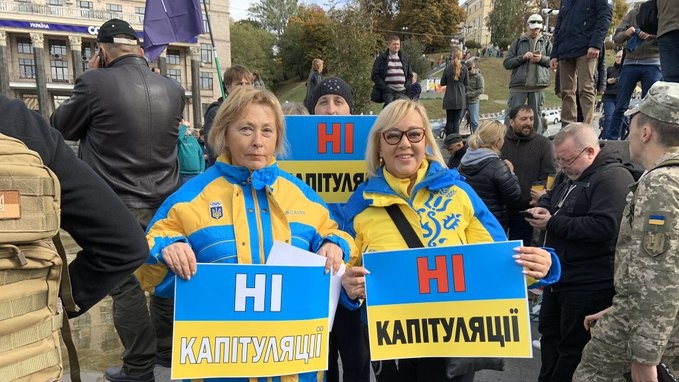 Протестувальники несли червоно-чорні, синьо-жовті та кримськотатарські прапори і скандували гасла: "Слуга виходь, народ прийшов", "Ні капітуляції", "Зелю геть!", "Україна – не рояль", "Імпічмент", "Слава Україні! Героям слава!", "Слава нації! Ні капітуляції!", "Ні відведенню військ", "Вибори після відновлення контролю".