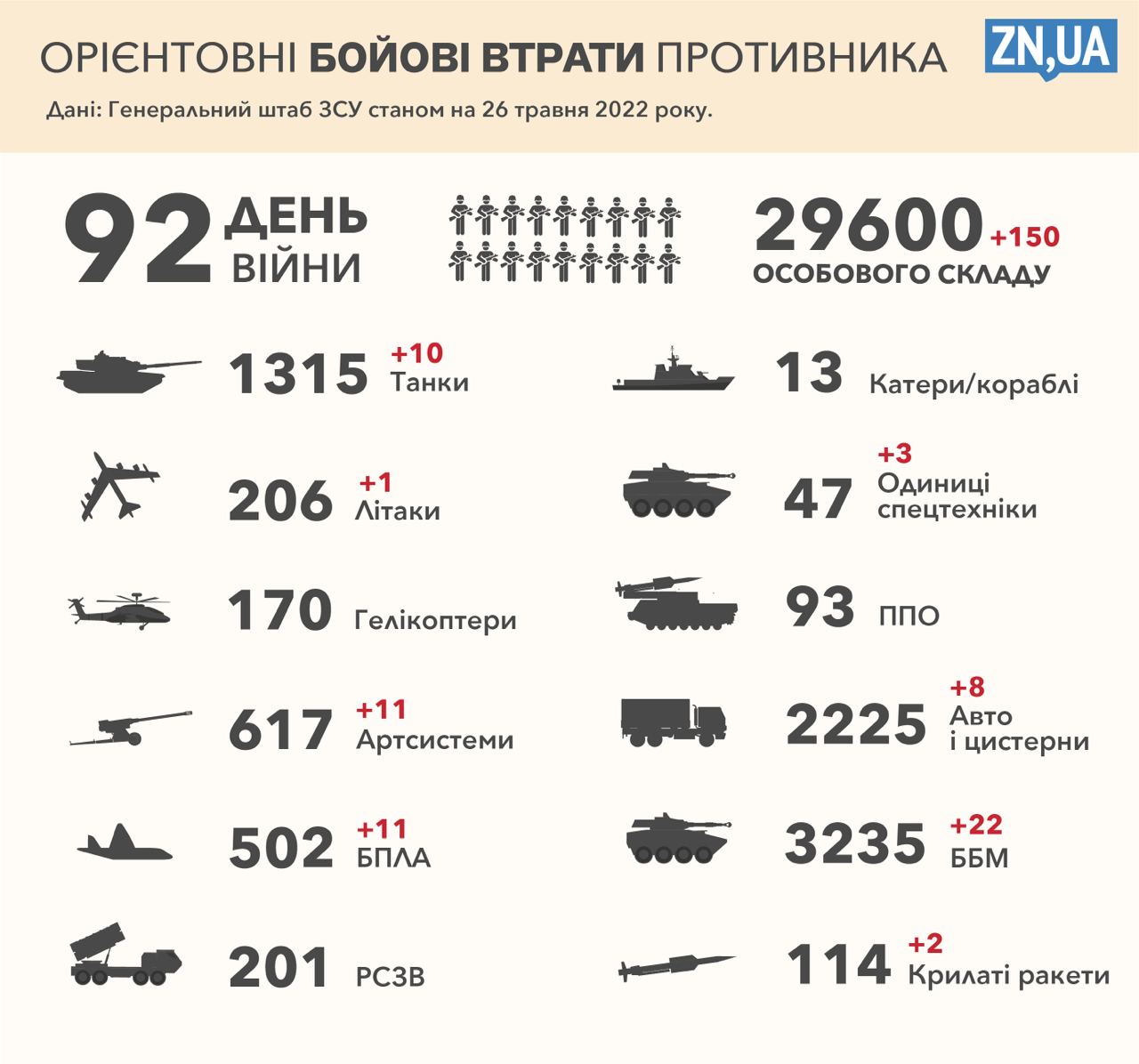 Протягом вчорашнього дня, 25 квітня, наші захисники знищили ще 150 окупантів. В Генштабі ЗСУ зазначають, що втрати серед особового складу армії РФ зросли до 29 600 російських військових.