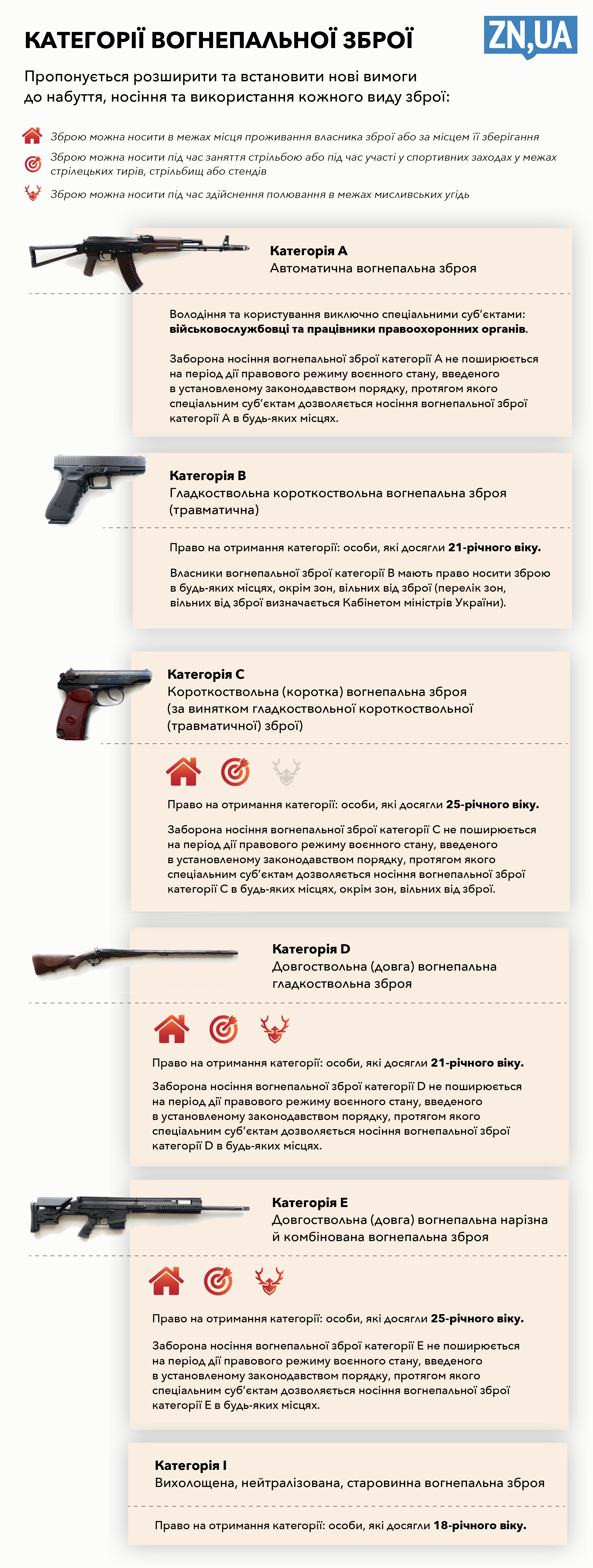 Згідно із запропонованими змінами зброю поділятимуть на кілька категорій: