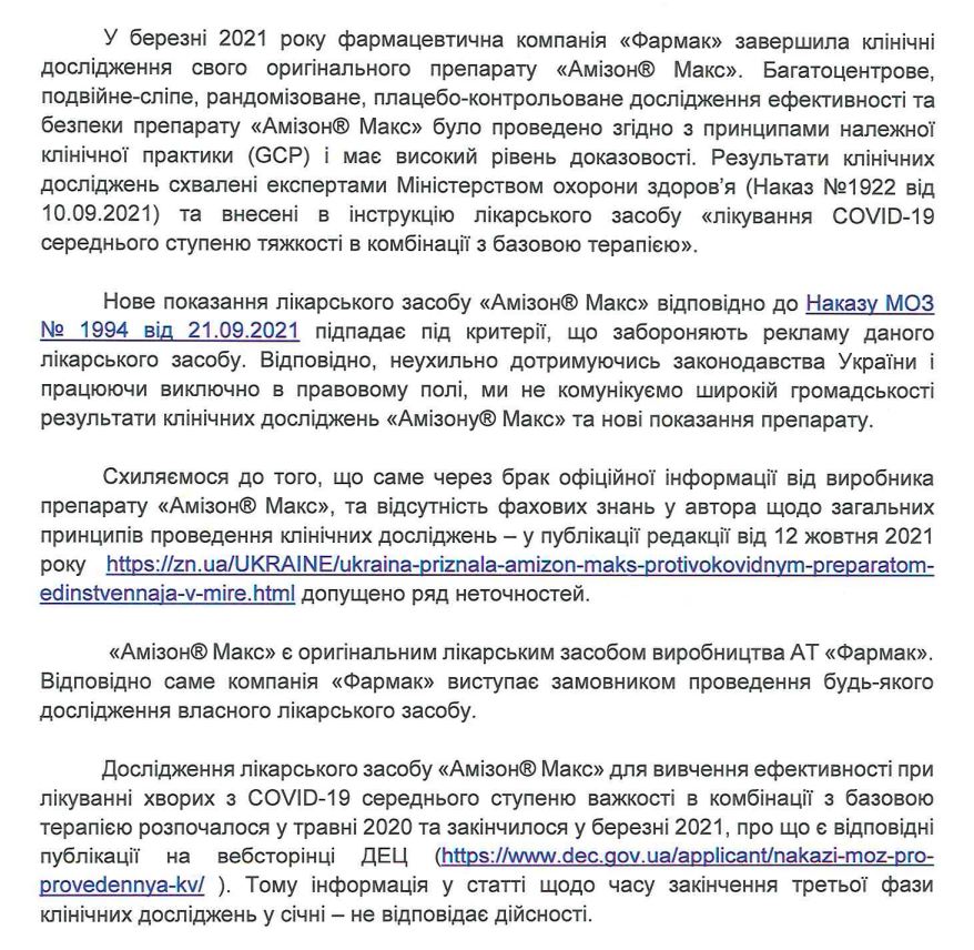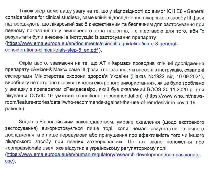 А вже у вересні 2021-го, після перереєстрації, "Амізон Макс" був віднесений до препаратів, показаним при середній тяжкості захворювання, викликаного COVID-19, в комбінації з базовою терапією. Попри те, що даних про четверту фазу клінічних досліджень препарату немає ніде, у формулюванні навіть не вказано — "для екстреного застосування". Як це було, наприклад, з відомим багатьом, включеним до протоколу лікування препаратом "Ремдесівір".