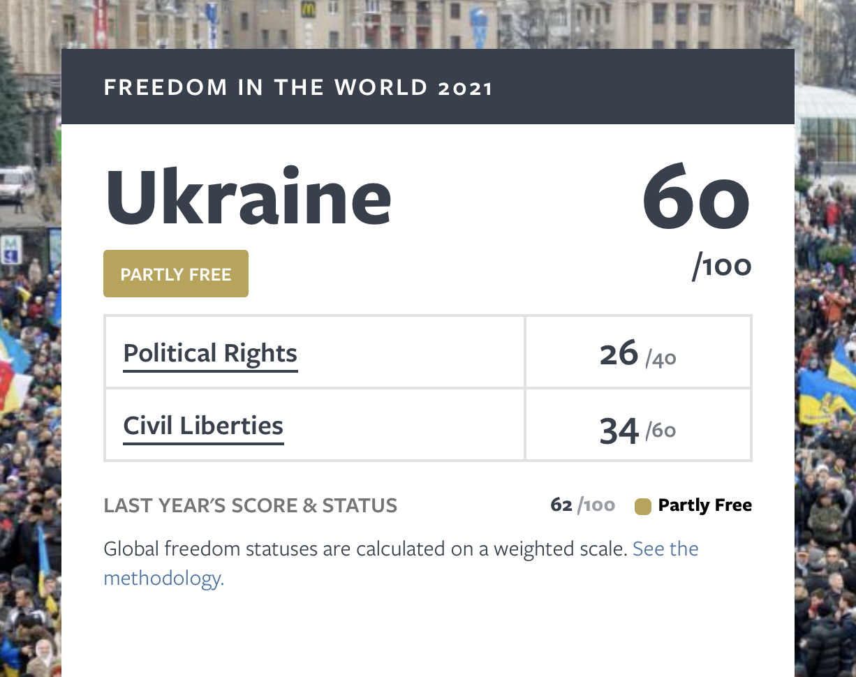 Так, за шкалою демократичної свободи Україна набрала 60 зі 100 можливих балів, зокрема 26 з 40 в сфері політичних прав і 34 з 60 в розрізі цивільних свобод.