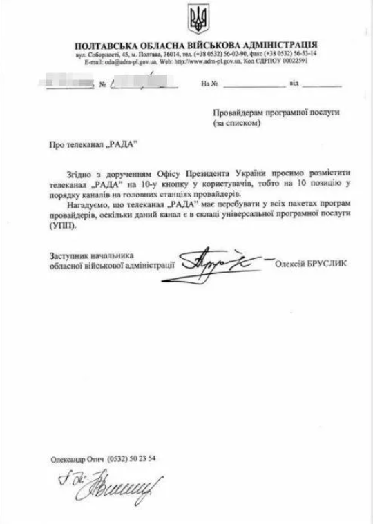 "Згідно з дорученням Офісу Президента України просимо розмістити телеканал "Рада" на 10-у кнопку у користувачів, тобто на 10 позицію в порядку каналів на головних станціях провайдерів", - йдеться в листі від заступника голови Полтавської обласної військової адміністрації Олексія Бруслика.