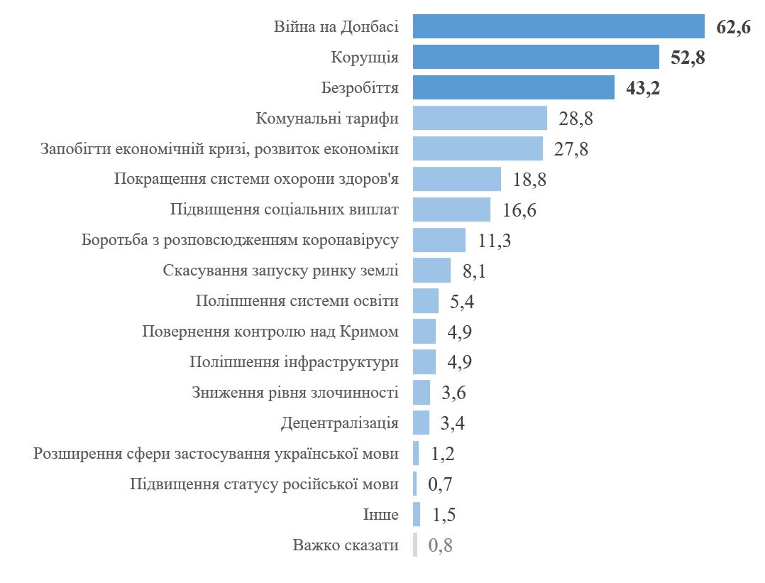 Далі йдуть комунальні тарифи (29%) та запобігання економічній кризі / розвиток економіки (28%). Боротьба з розповсюдженням коронавірусу лише на восьмому місці (11%).