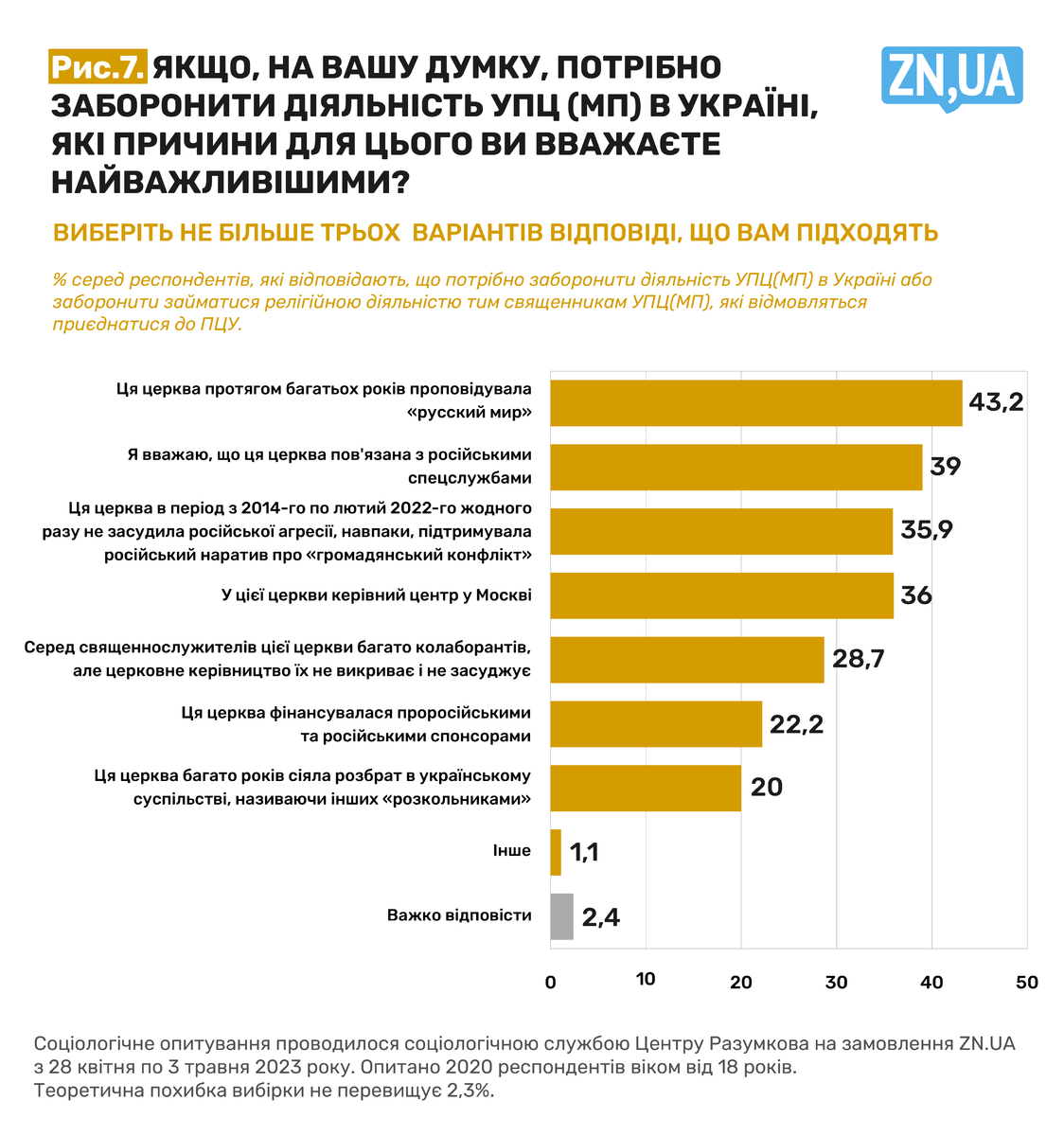 Згідно із опитуванням Центру Разумкова на замовлення ZN.UA, просування в проповідях ідеї «русского міра» — серйозний докір, який кидають на адресу УПЦ МП 43,2% українців.