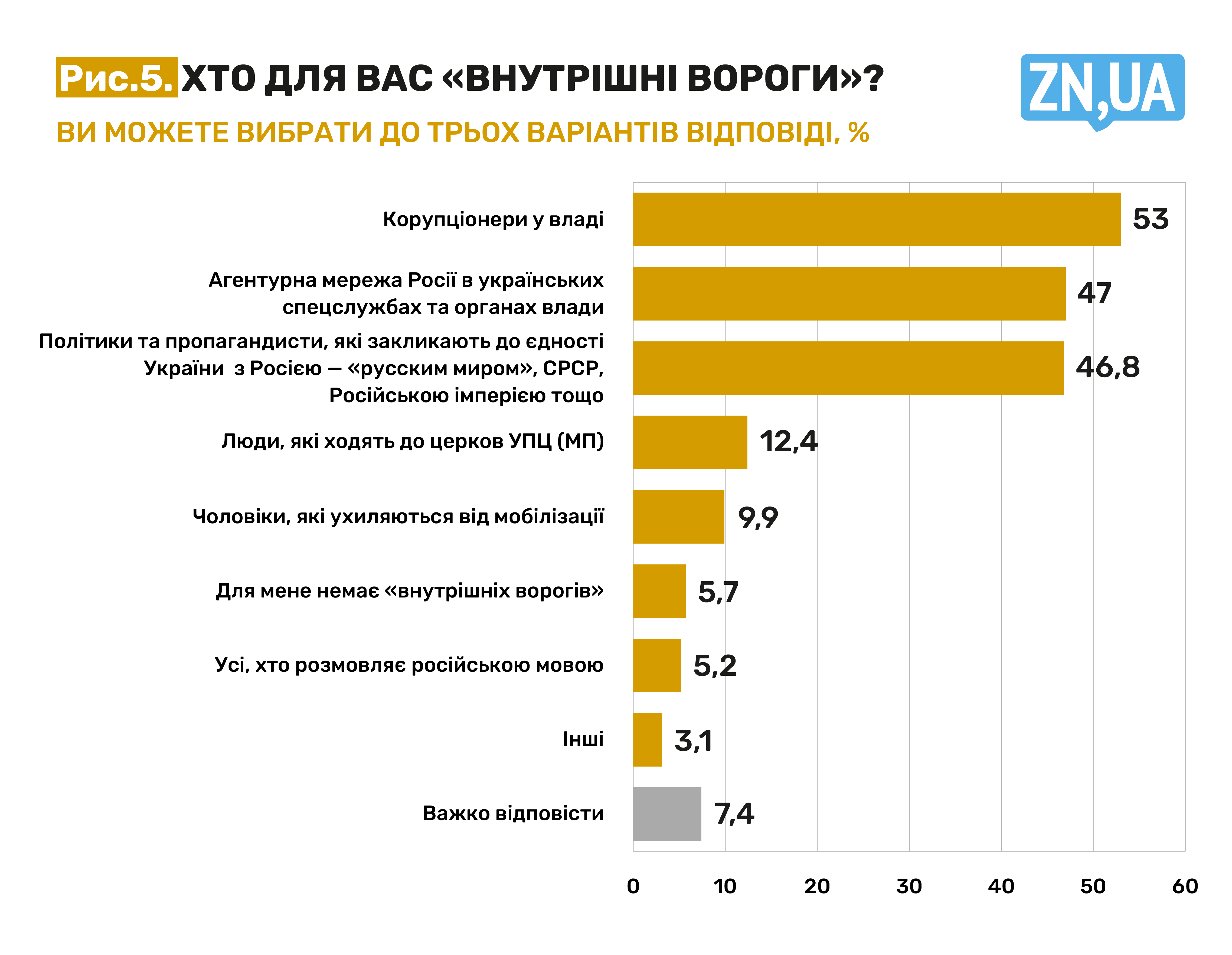Водночас повномасштабне російське вторгнення загострило багато кутів. Так, 12% опитаних на запитання: «Хто для вас є внутрішнім ворогом?» відповіли: «Ті, хто відвідує УПЦ МП».