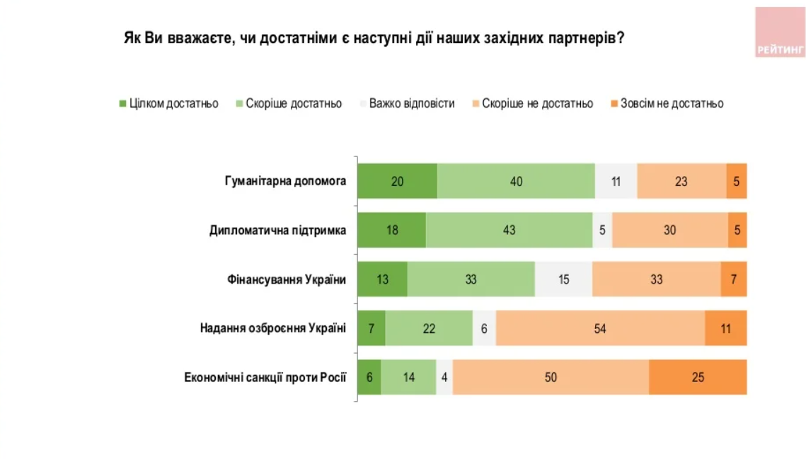 Дипломатичну та гуманітарну допомогу вважають достатньою близько 60%, хоча на початку березня її як достатню оцінювали близько 50%.