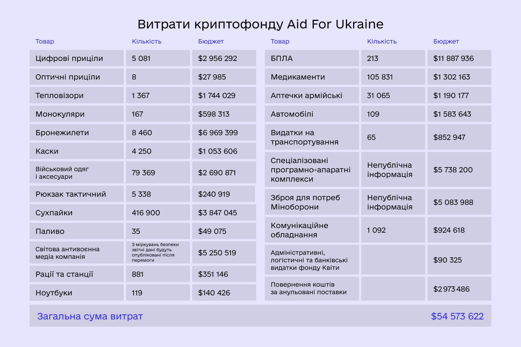 Українці перерахували на рахунки криптофонду Aid For Ukraine 54 мільйони доларів, завдяки чому були закуплені 100 авто, 200 дронів та тисячі одиниць засобів захисту для українських захисників. Про це повідомив голова Мінцифри Михайло Федоров.