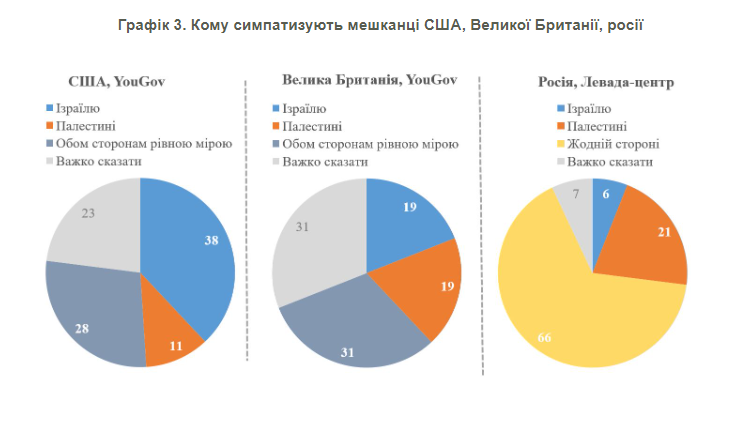 Так, у США тих, хто симпатизує Ізраїлю, найбільше, але менше половини населення – 38%. І хоча лише 11% симпатизують Палестині, але значна частина американців симпатизують обом сторонам – 28%.
