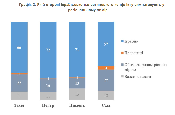 Зокрема, симпатизують насамперед Ізраїлю у всіх регіонах України. Максимальний рівень підтримки Палестині не перевищує 4%.