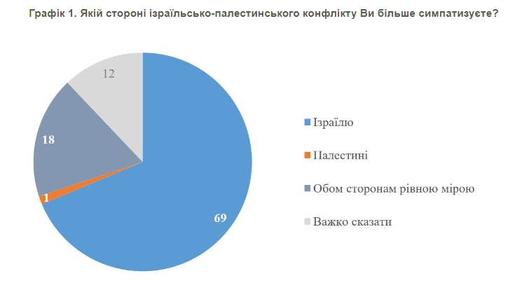 Переважна більшість українців, а саме 69%, в оцінці конфлікту між Ізраїлем та Палестиною, симпатизують Ізраїлю. Водночас лише 1% симпатизують Палестині, а 18% респондентів відповіли, що вони в однаковій мірі симпатизують обом сторонам. Такі дані соціологічного дослідження опублікував Київський міжнародний інститут соціології.