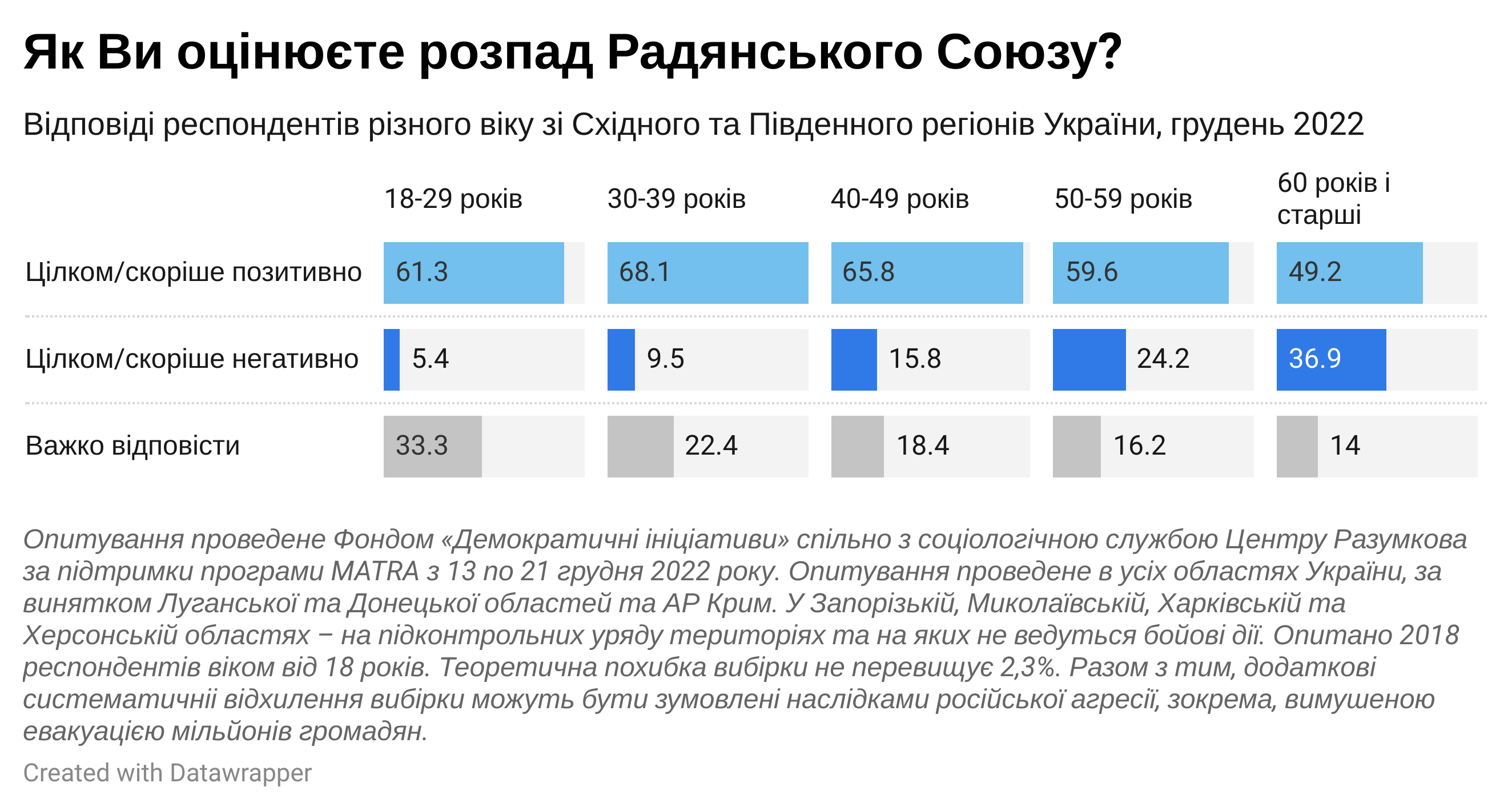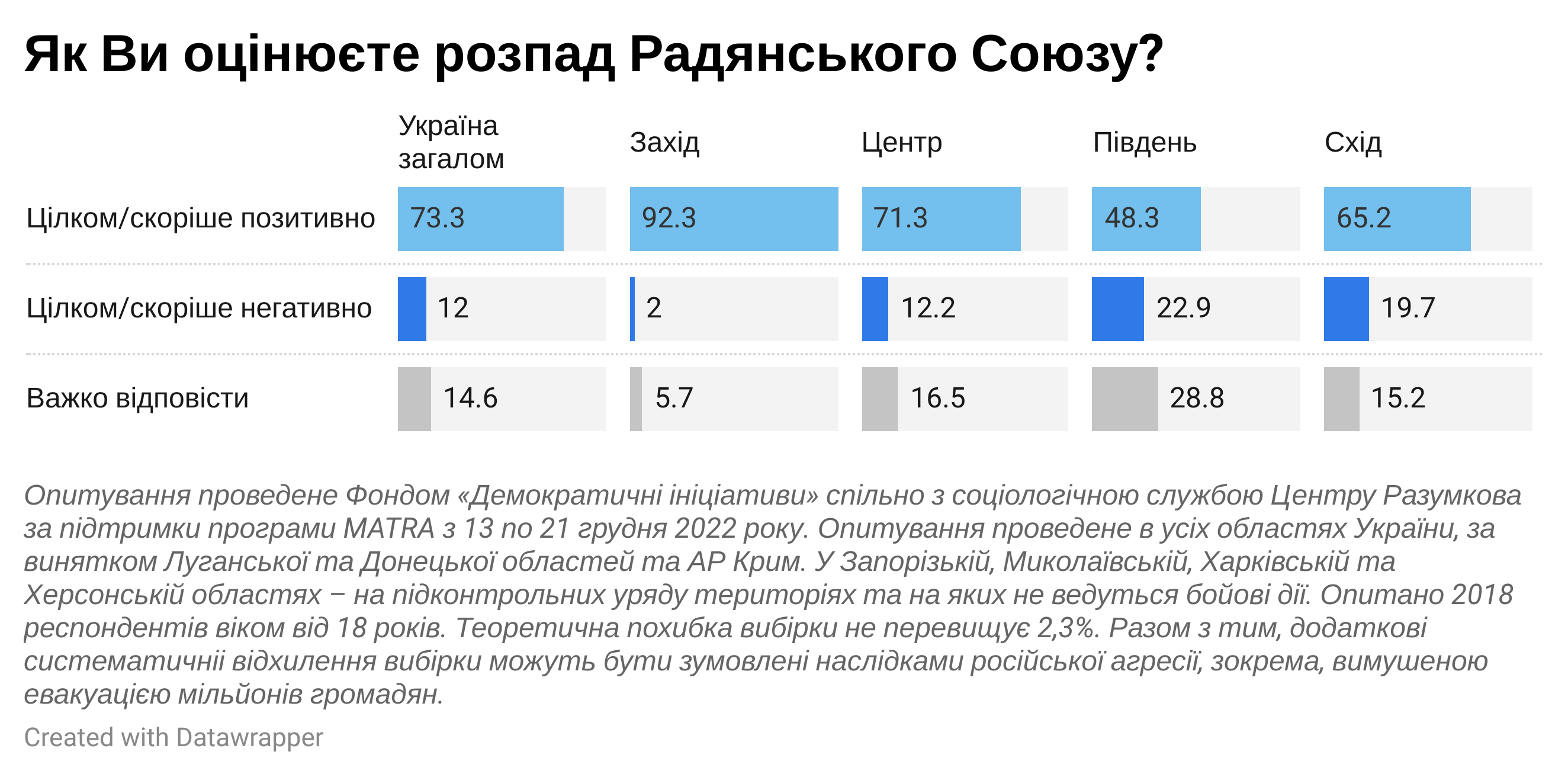 Після початку повномасштабної війни РФ проти України серед населення нашої держави збільшується кількість людей, які ставляться до розпаду Радянського Союзу як до позитивної події, а також тих, хто підтримує політику засудження його діяльності. Про це свідчать результати опитування фонду «Демократичні ініціативи» імені Ілька Кучеріва та соціологічної служби Центру Разумкова, проведеного з 13 по 21 грудня 2022 року.