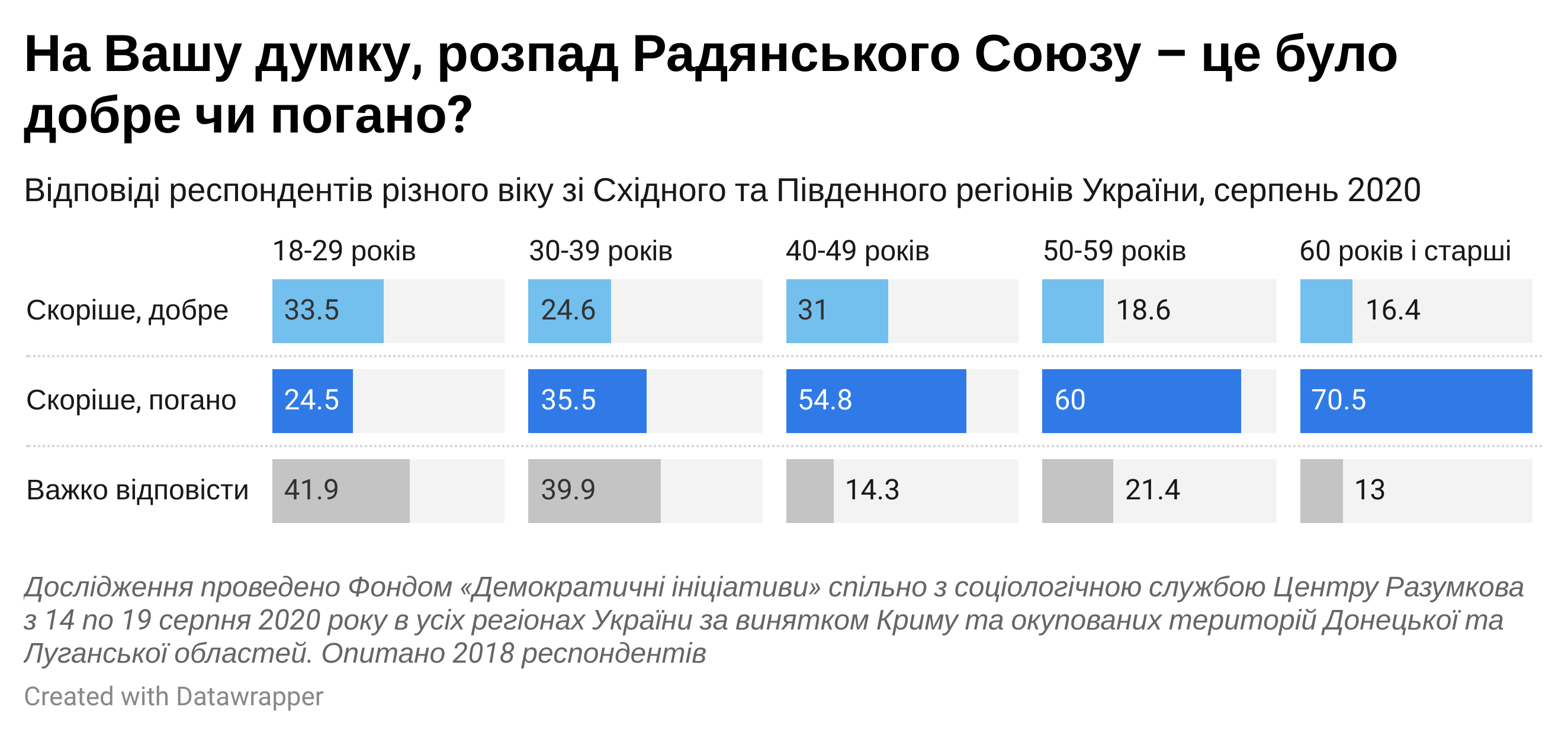 Також опитування дворічної давності відобразило суттєві вікові відмінності у ставленні до розпаду СРСР у південних та східних областях України. Представники молодшого покоління давали більше позитивних оцінок, хоча багато й не мали однозначної думки. Більшість же старших респондентів вважали згадану подію негативною.