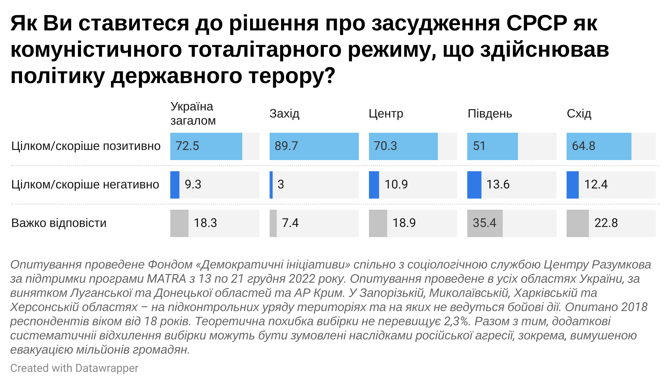 Крім цього, 72,5% опитаних українців висловили підтримку політики держави щодо засудження Радянського Союзу як комуністичного тоталітарного режиму, який проводив політику державного терору. Думка домінує в усіх регіонах, однак найбільше схвалення висловили респонденти на заході країни (майже 90%), а найменше – на півдні (51%). На сході позитивних оцінок – 65%, у центрі – 70%.