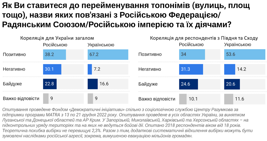 Зараз більше половини громадян (59%) виступають за перейменування вулиць і площ, назви яких пов’язані з Росією, СРСР чи Російською імперією. Меншість опитаних людей позитивно ставляться до цих заходів лише на півдні нашої держави. Водночас ,по всій Україні, окрім західної її частини, значна частина респондентів (20–28%) виявила байдужість до перейменування топонімів.