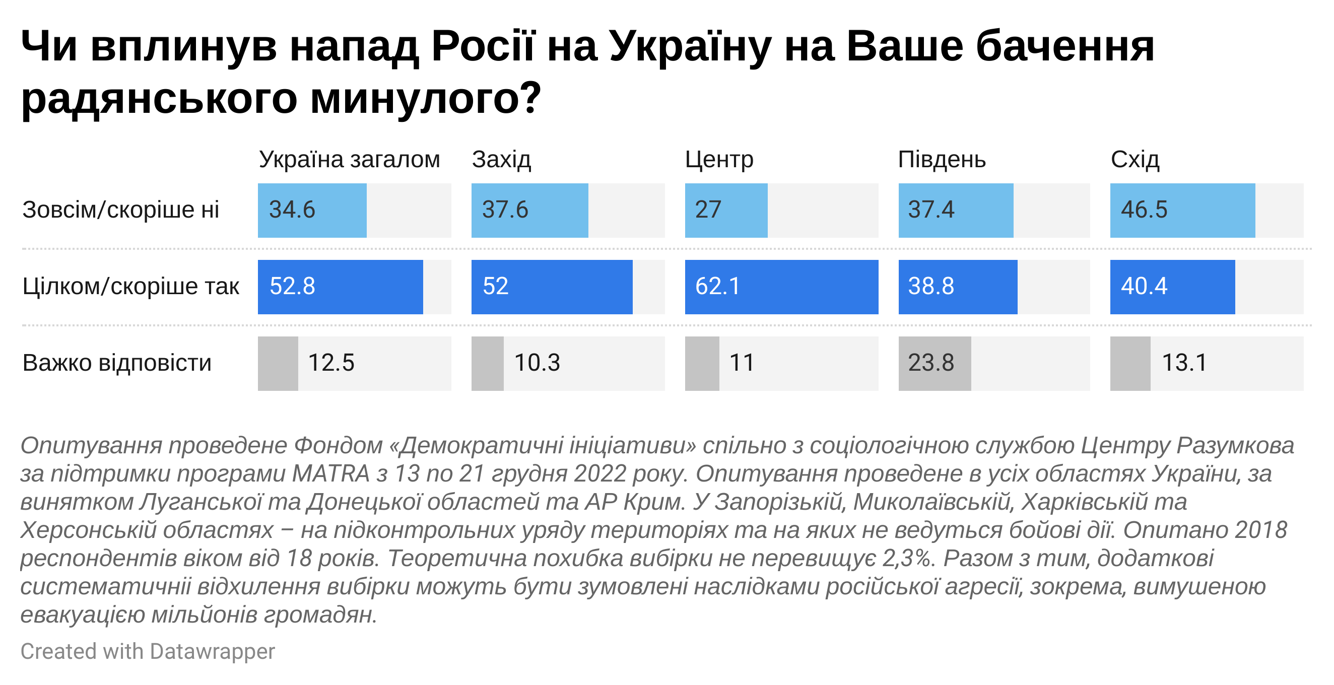 Дещо більше половини опитаних жителів України заяивли, що вторгнення військ РФ на територію України стало стимулом для переосмислення радянського минулого. Найбільше респондентів певною мірою змінили свою думку в центральних областях (62%), найменше – на півдні (39%) і сході (40%). Показник позитивних вдповідей серед учасників дослідження в західному регіоні – 52%.