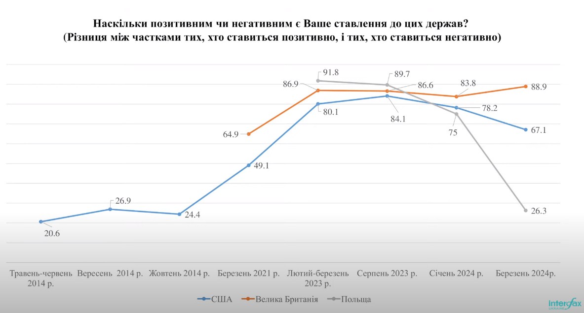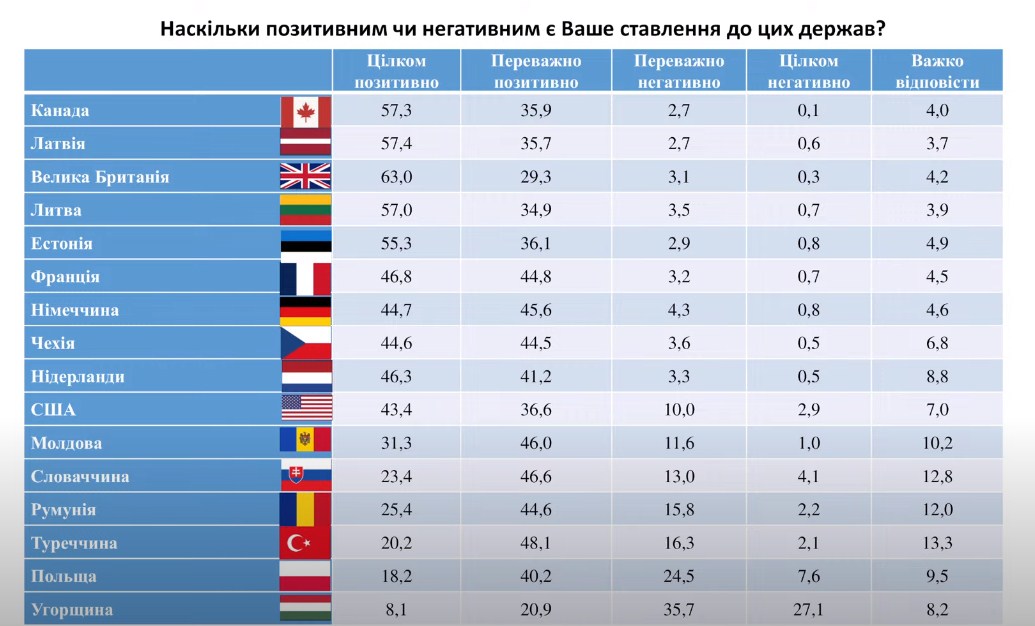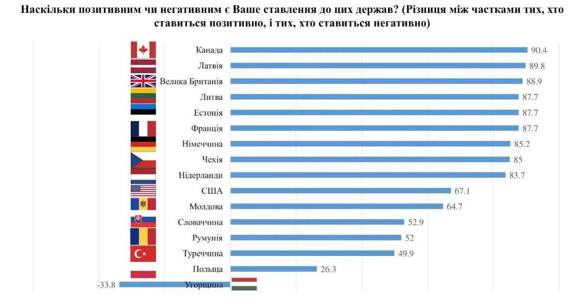 Серед країн, до яких найгірше ставлення – Росія (95%), Білорусь (87%), Іран (82%), Китай (72,5%), Угорщина (59%).