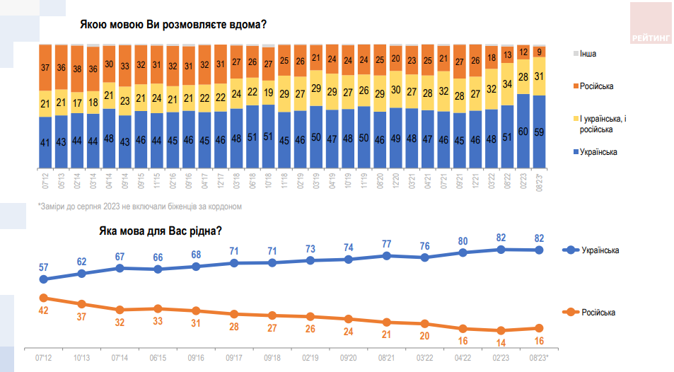Соціологи вказують, що з березня 2022 року в Україні помітно зменшується використання російської мови у побуті. При цьому для 82% опитаних українська мова є рідною, для 16% такою є російська.