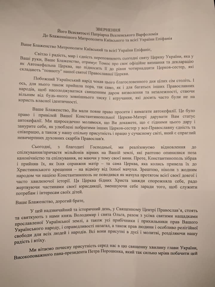 "Ви мали повне право просити і вимагати автокефалії. Це було право і привілей вашої Константинопольської Церкви-Матері дарувати вам статус автокефалії. Ми щиросердно молимося, що ви докажете, що є гідними цього дару і занурити себе як улюблені побратими інших Церков-сестер у все-Православну єдність та співпрацю, а також у нашу спільну присутність і працю у сучасному світі, який є спраглий невичерпних духовних скарбів Православ'я ", - сказав Варфоломій.