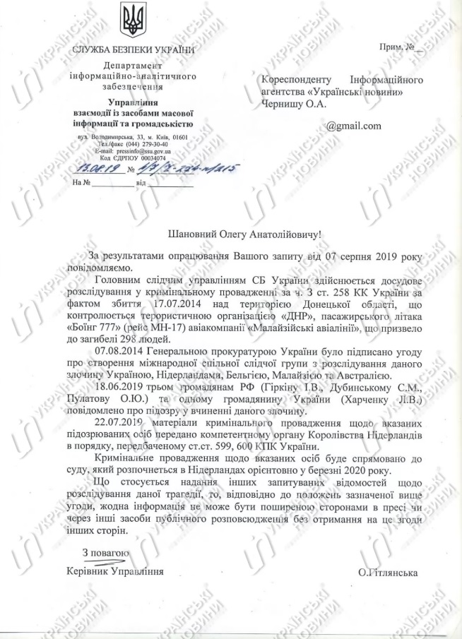 "Відповідно до угоди про створення Міжнародної слідчої групи, ніяка інформація не може бути оприлюднена в пресі без згоди інших сторін угоди", - наголошується у документі.