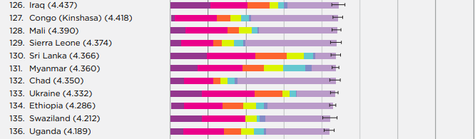 "У цьому році ми порівнюємо якість життя населення протягом більш тривалого періоду, в середньому десять років. Серед двадцяти країн, в яких рівень щастя впав найбільше, сім розташовані на Близькому Сході і в Північній Африці, шість в Африці на південь від Сахари і три в Західній Європі. Найзначніше зниження рівня щастя спостерігається у Венесуелі, Індії, Малайзії та Україні", - йдеться в доповіді.