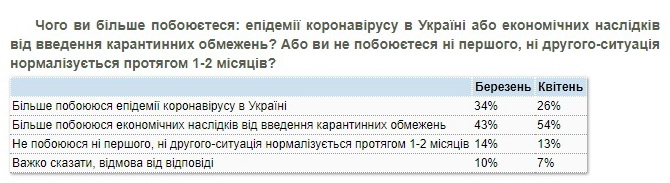 Згідно з даними дослідження, в першій половині квітня 54% українців побоювалися економічних наслідків карантину, більше ніж епідемії COVID-19. У той час як у березні таких було 43%.