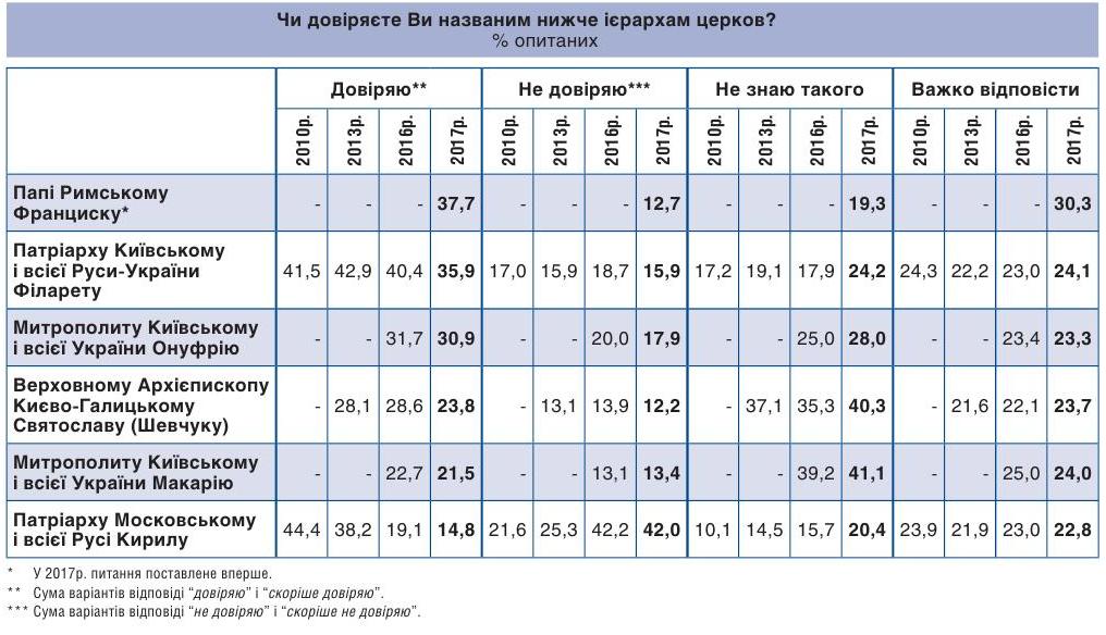 Митрополиту Онуфрію (УПЦ МП) довіряють 30,9%, не довіряють – 17,9%; главі Української греко-католицької церкви Святославу довіряють 23,8%, не довіряють 12,2%; митрополиту Макарію (УАПЦ) довіряють 21,5%, не довіряють - 13,4% опитаних.