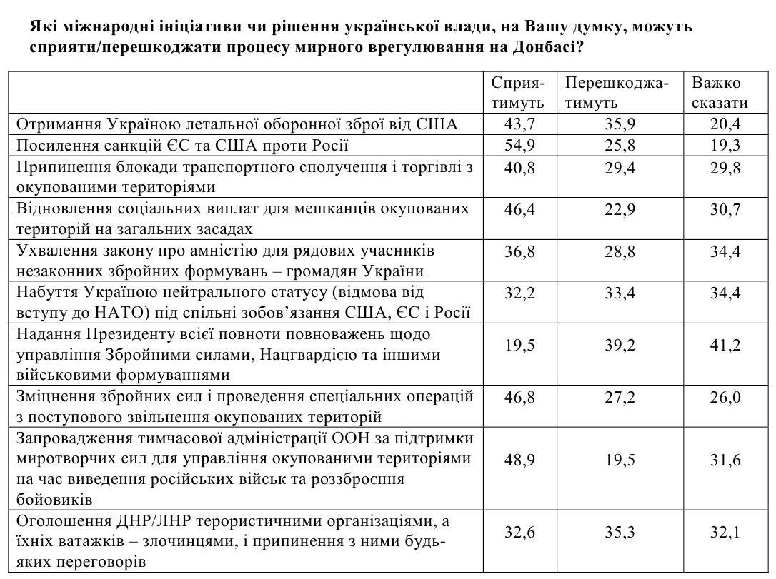 - запровадження тимчасової адміністрації ООН за підтримки миротворчих сил для управління окупованими територіями на час виведення російських військ та роззброєння бойовиків ("сприятиме" – 49%, "перешкоджатиме" – 19,5%),