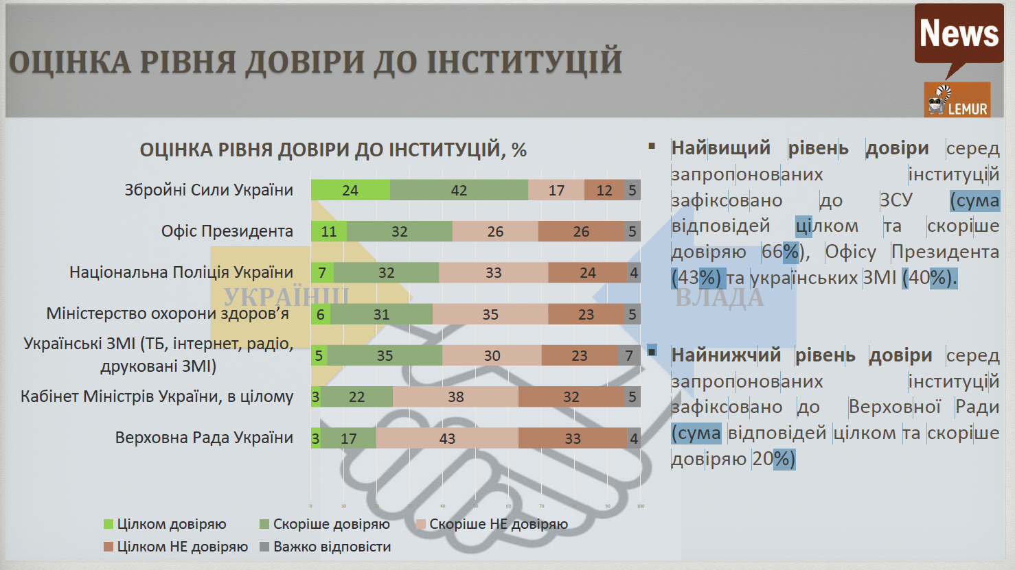 Найбільшу довіру до Національної поліції висловлюють 39% опитаних, а Міністерству охорони здоров'я – 36%. Кабінету міністрів найбільше довіряють 25% українців, а Верховні Раді – 20% громадян.