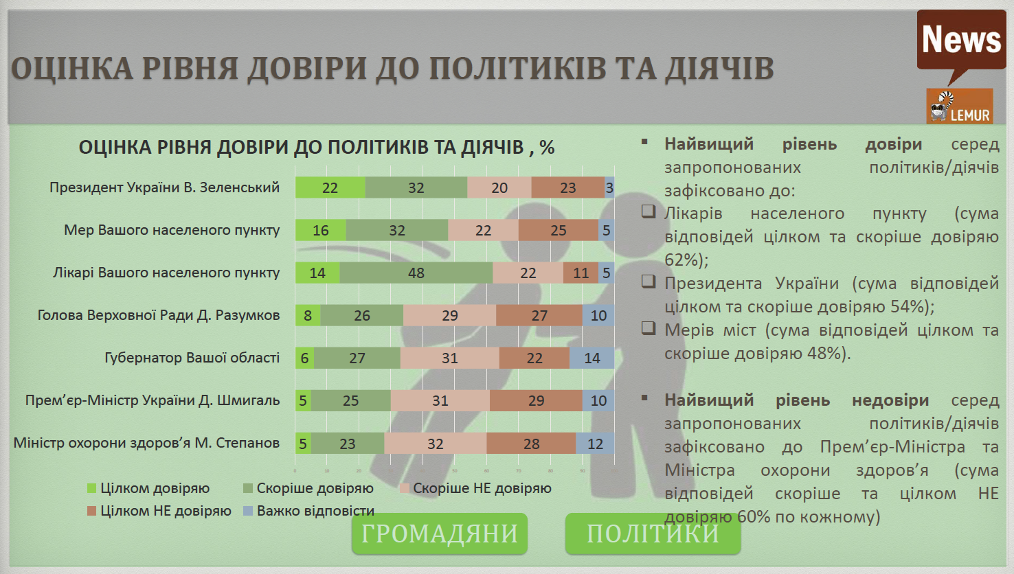 Голові парламенту Дмитру Разумкову найбільше висловлюють довіру 34% громадян, а прем'єру Денису Шмигалю – 30% респондентів. Очільнику МОЗ Максиму Степанову найбільше довіряють 28% опитаних.