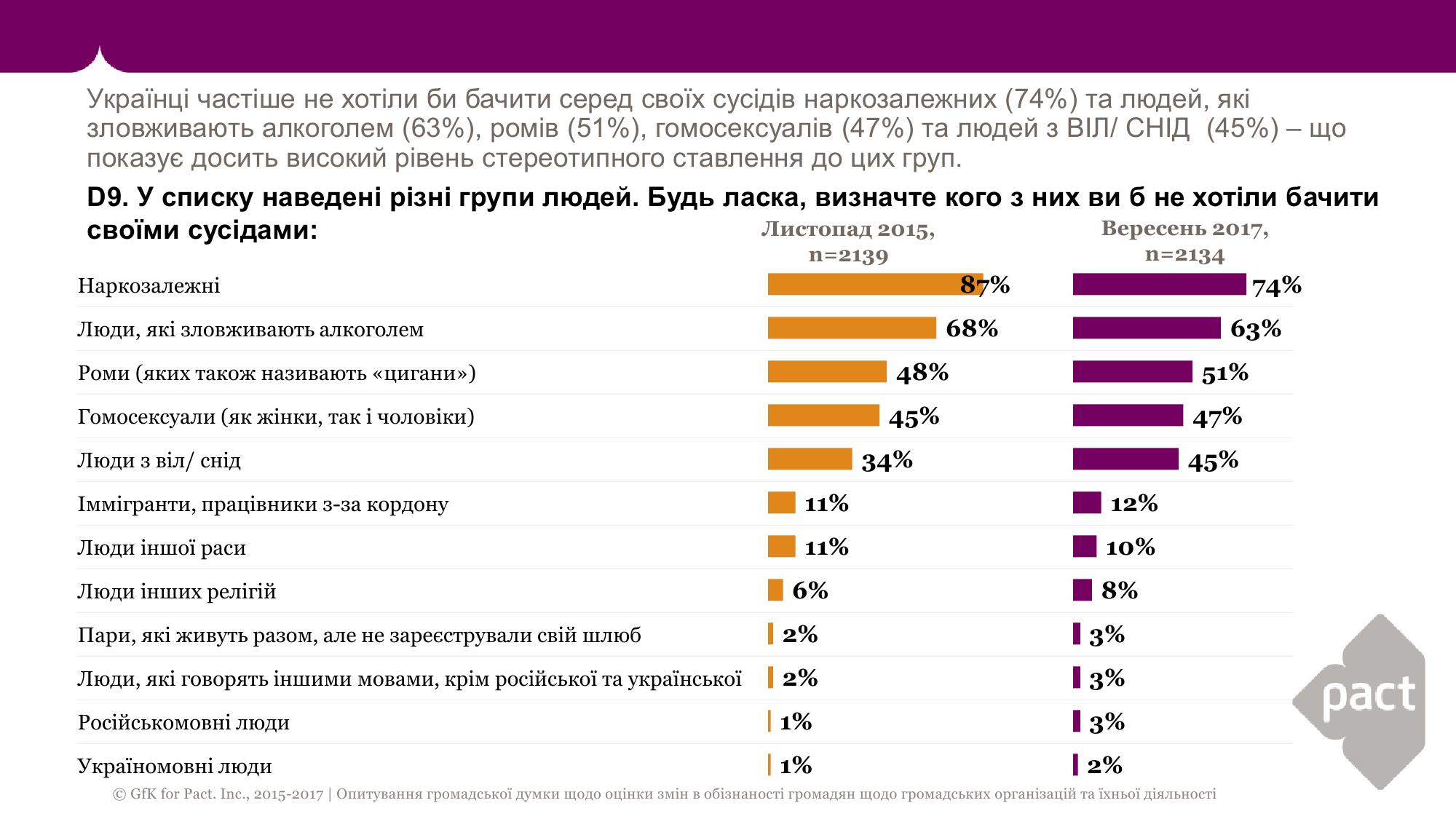 Українці частіше не хотіли би бачити серед своїх сусідів наркозалежних (74%) та людей, які зловживають алкоголем (63%), ромів (51%), гомосексуалів (47%) та людей з ВІЛ/ СНІД (45%), свідчать дані опитування GfK Ukraine на замовлення організації Pact.