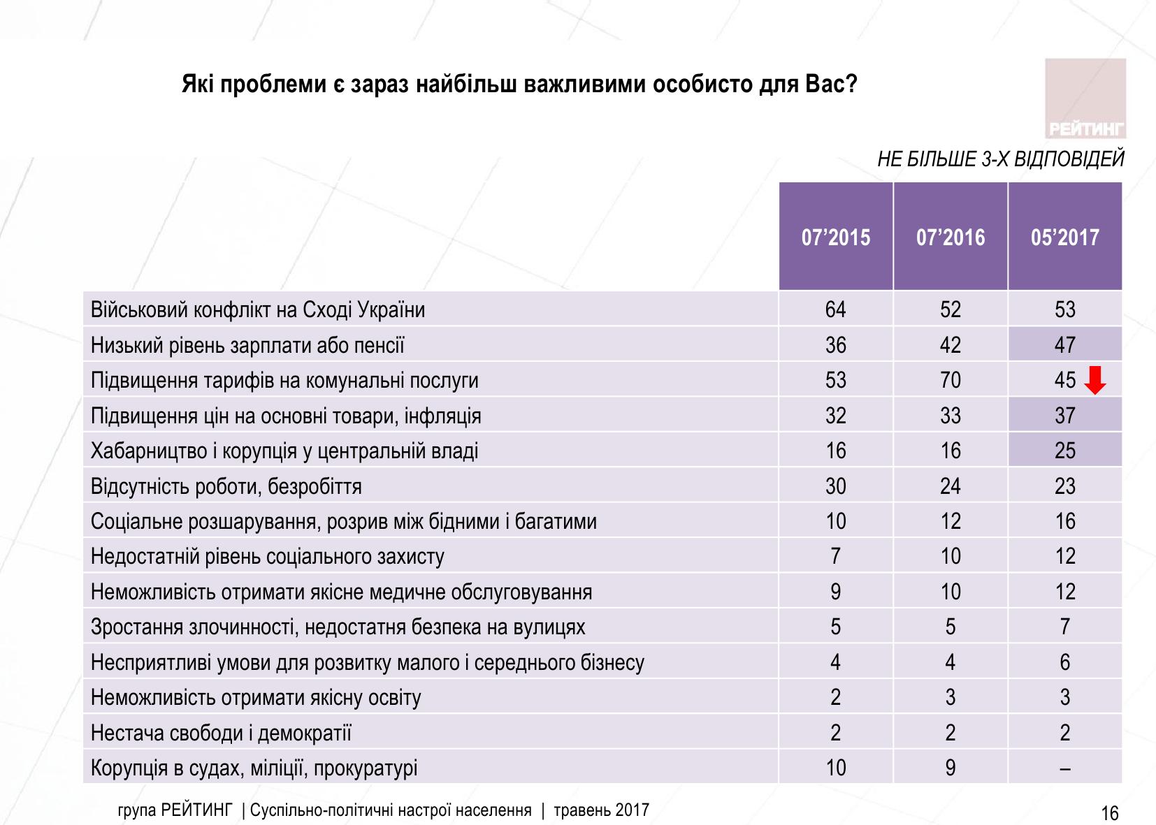 У травні 2017 року більше половини українців (53%) вважали військовий конфлікт на Сході країни найважливішою проблемою, свідчать дані опитування Соціологічної групи "Рейтинг".