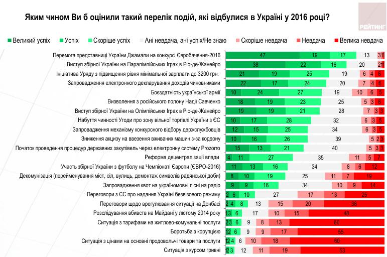 Також серед успіхів року респонденти назвали ініціативу уряду щодо підвищення рівня мінімальної зарплати до 3200 грн, впровадження електронного декларування доходів чиновників, виступ збірної України на Олімпійських іграх в Бразилії, звільнення з російського полону Надії Савченко.