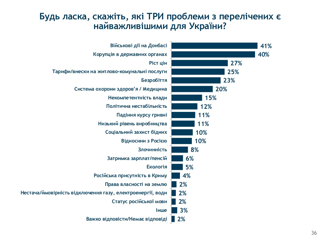 Відповідаючи на питання про три головні проблеми, українці також вказали на зростання цін (27%), тарифи на житлово-комунальні послуги (25%) і безробіття (23%).