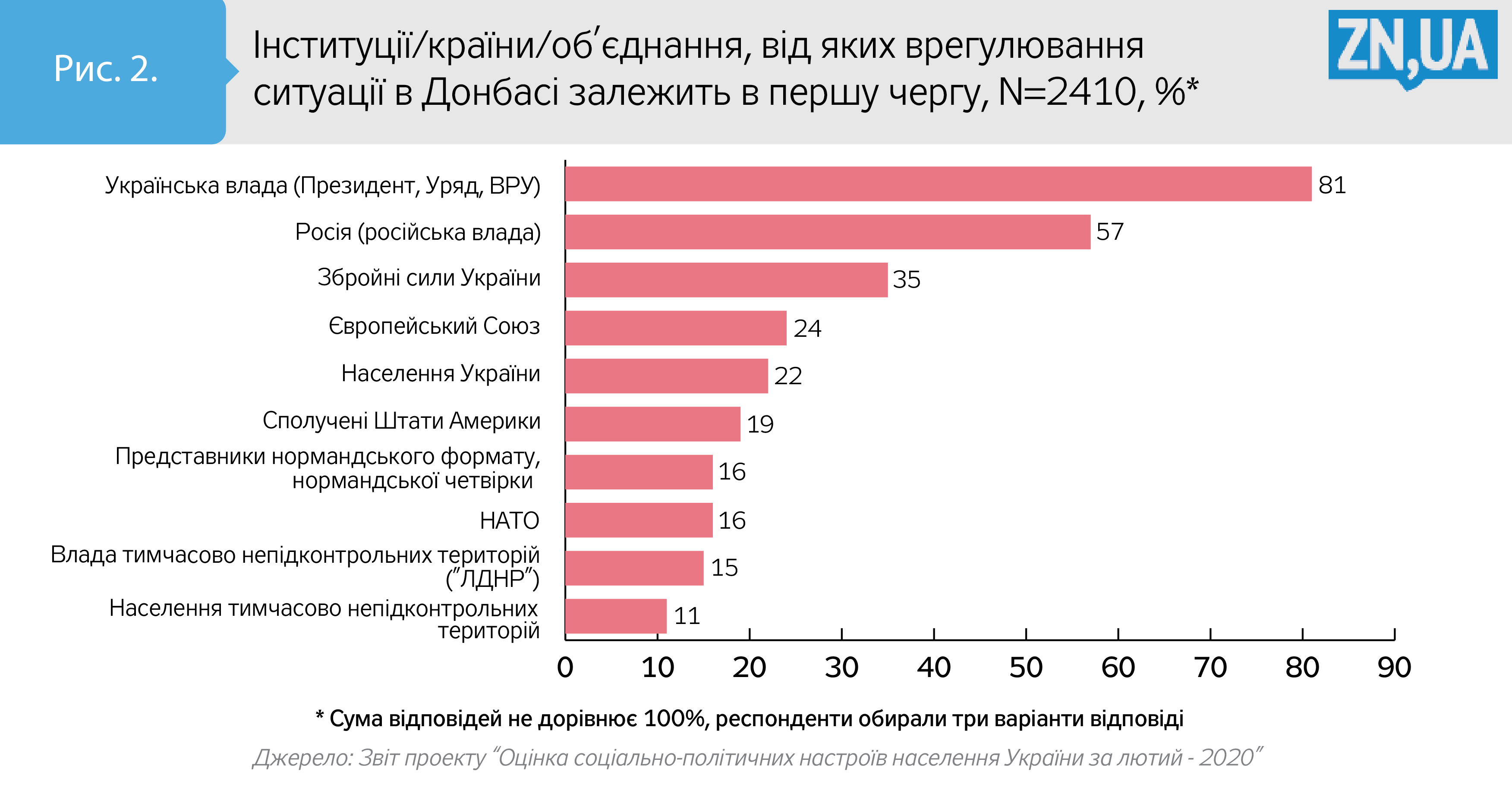 Наголошується, що респондентам, які відповідали, від кого в першу чергу залежить врегулювання ситуації в Донбасі, можна було вибрати три варіанти відповіді, але при цьому лише 57% з них відзначили, що вирішення конфлікту залежить від Росії (її влади). 35% наших співгромадян (особливо на Заході країни) вірять у міць і бойовий дух Збройних сил України, вважаючи, що насамперед врегулювання на Сході країни залежить від ЗСУ.