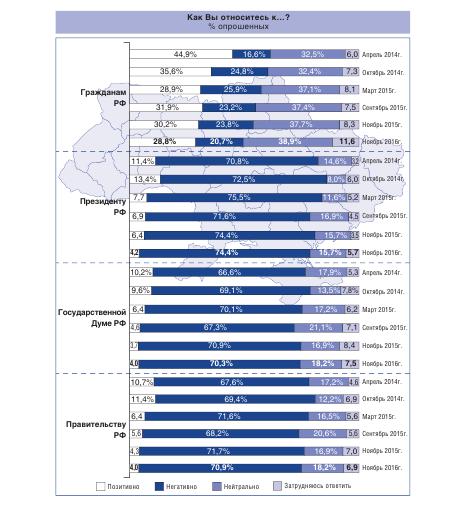 У листопаді 2016 року частка тих, хто негативно ставиться до президента РФ, становила 74% і аналогічна показнику квітня 2014 року. Подібна тенденція спостерігається і щодо інших державних інститутів РФ – уряду та Державної думи.