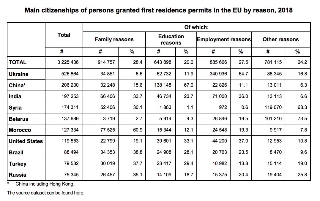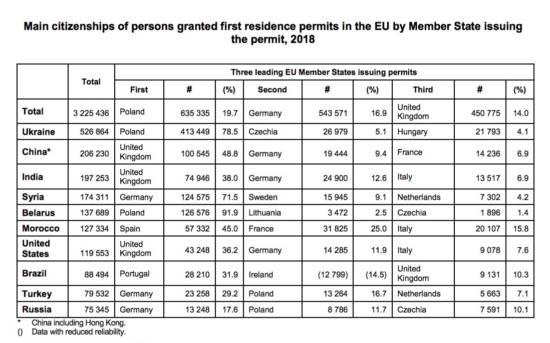 Зазначається, що громадяни України продовжили отримувати найбільшу кількість дозволів, випереджаючи при цьому китайців, індійців та сирійців. Понад 78% отримали дозвіл на проживання у Польщі. Загалом близько половини усіх перших дозволів на проживання у ЄС було видано громадянам України, Китаю, Індії, Сирії, Білорусі, Марокко, США, Бразилії, Туреччини та Росії, пише "Укрінформ" з посилання на Євростат.
