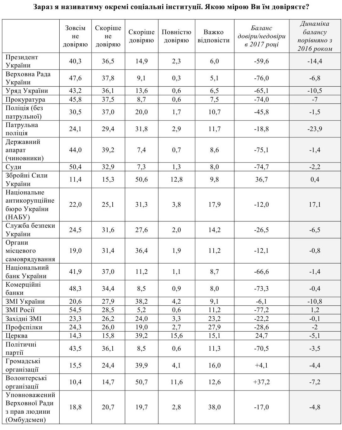 Негативний баланс довіри/недовіри мають й інші соціальні інституції: поліція (-46%), СБУ (-26,5%), профспілки (-25%), західні ЗМІ (-22%), патрульна поліція (-19%), омбудсман (-17%), НАБУ (-12%), органи місцевого самоврядування (-12%), ЗМІ України (-6%).