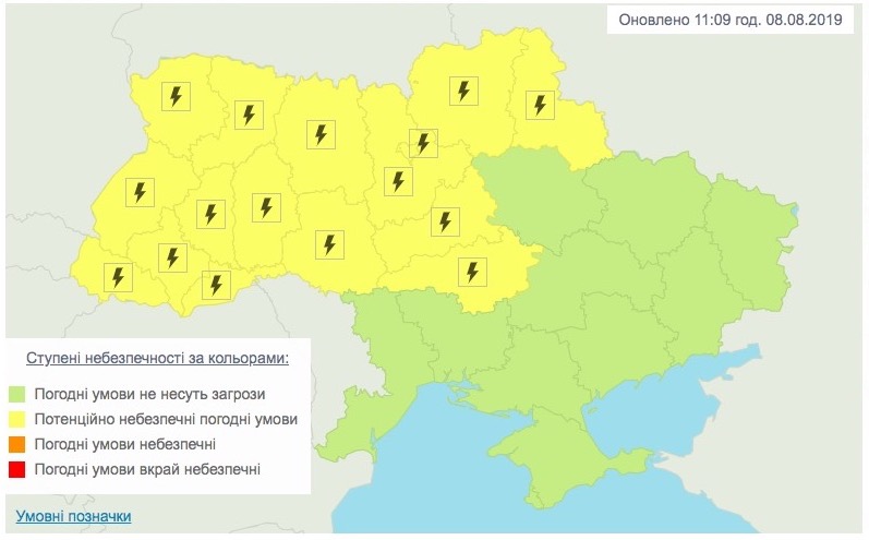 В Україні вдень у четвер, 8 серпня, на заході, півночі та центрі очікуються потенційно небезпечні для населення та інфраструктури погодні умови. Згідно з прогнозом Укргідрометцентру, передбачаються грози й посилення вітру 15-20 м/с, у деяких районах випаде град.