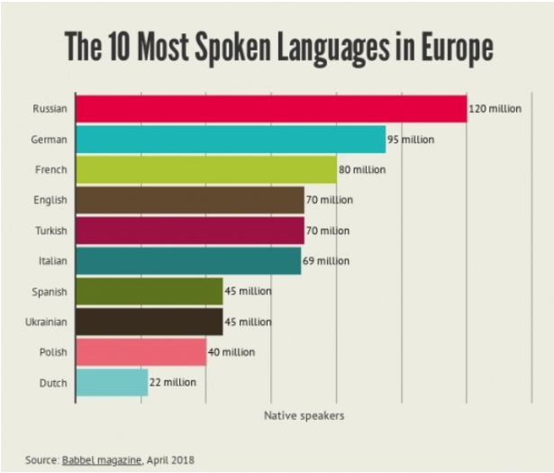 Найбільше людей у Європі говорять російською, носіїв цієї мови виявилося 120 мільйонів осіб. Друге місце зайняла німецька мова, якою розмовляють 95 мільйонів європейців. Французька, яка опинилася на третьому місці, є рідною для 80 мільйонів чоловік.