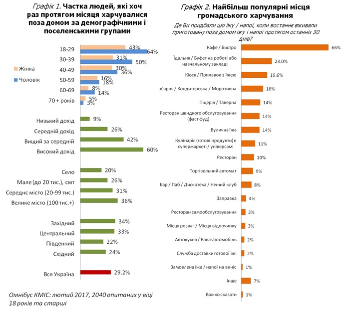 Мешканці України надають перевагу "демократичним" закладам громадського харчування. До лідерів відвідування можна віднести кафе або бістро, на які припадає дві третини усіх останніх відвідувань. Популярним також є харчування в їдальнях або буфетах у місцях роботи і навчання (23,0% усіх останніх відвідувань ) і купівля готової їжі у вуличних кіосках/ прилавках із їжею.