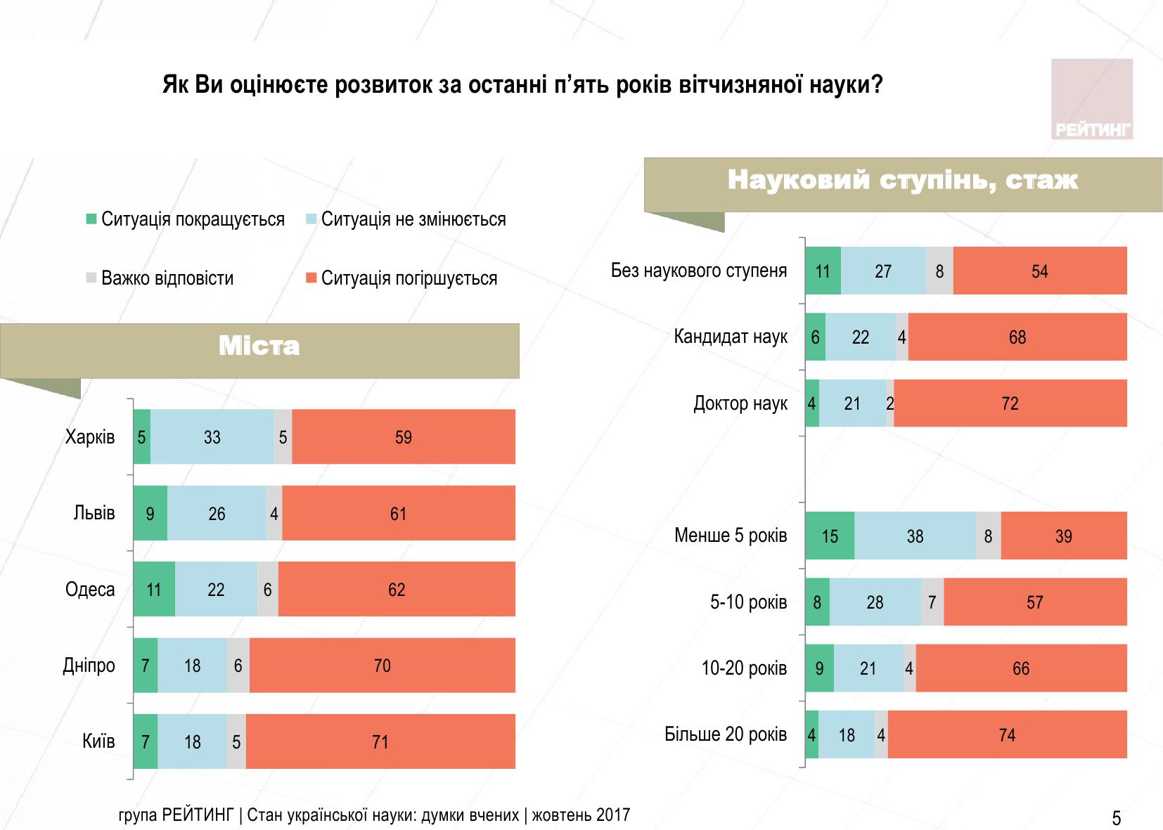 При цьому 46% опитаних науковців зазначили, що погіршується стан справ в науковій установі, в якій вони працюють. 30% заявили про стабільність і лише 18% – про покращення.