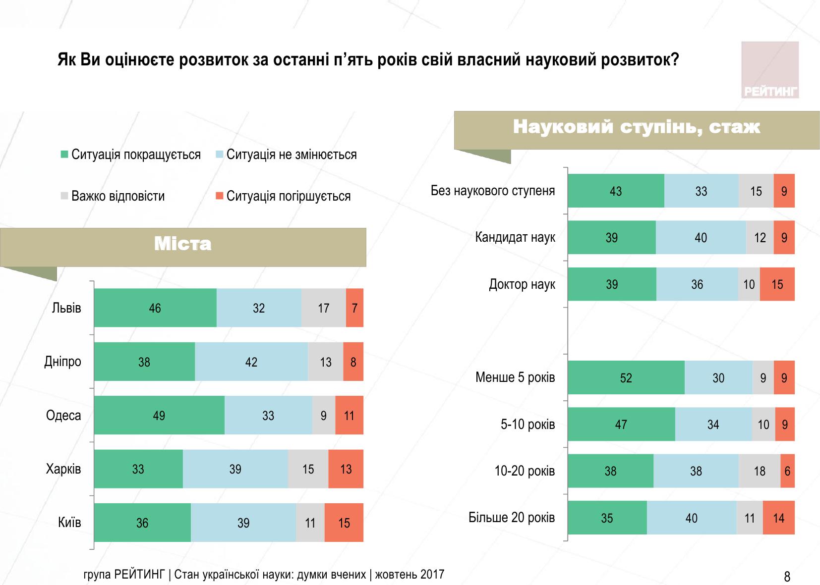 У той же час, найбільш оптимістичні оцінки серед науковців стосуються їх власного наукового розвитку за останні п'ять років. Про поліпшення в цьому випадку заявили 40% опитаних, про стабільність – 37%, про погіршення – лише 10%, а 13% не змогли оцінити стан власних справ.