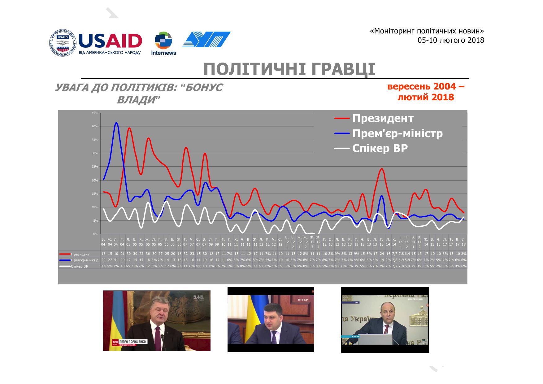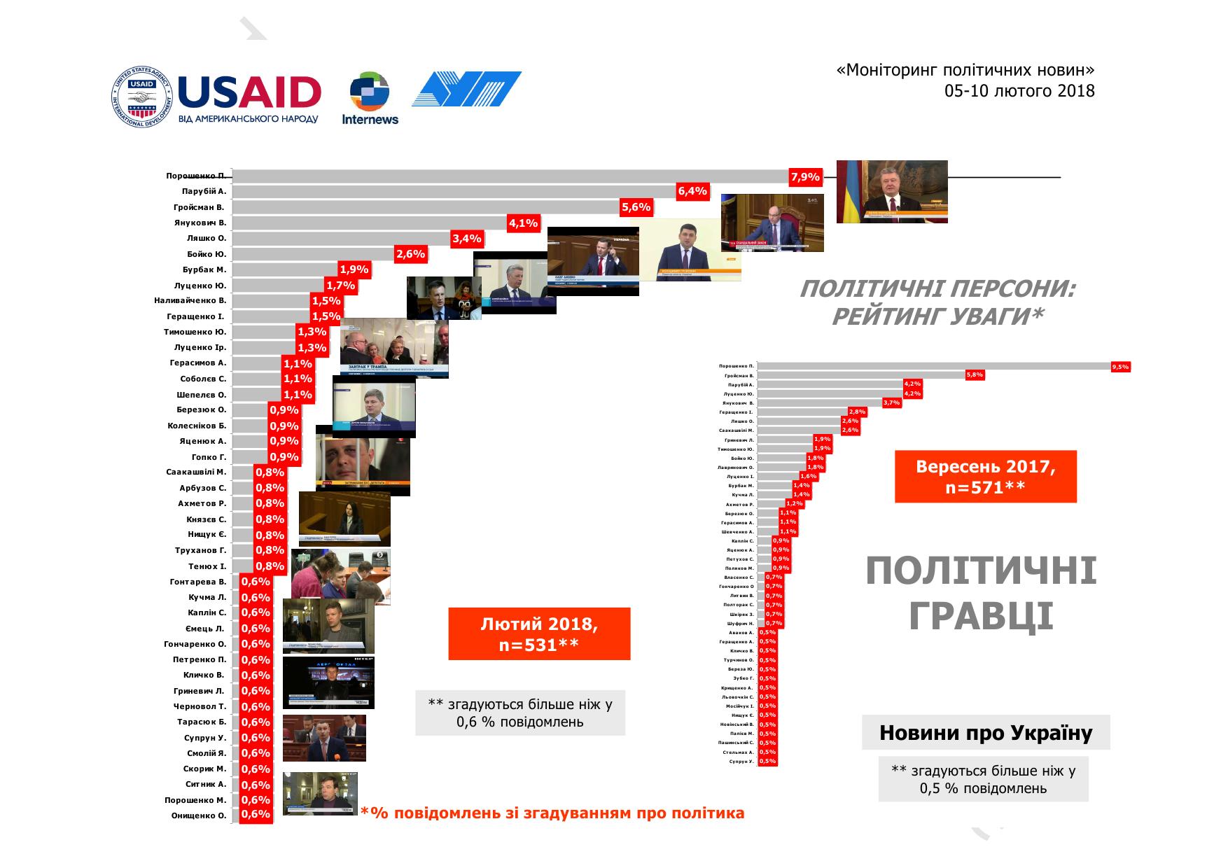 На початку лютого 2018 року у новинних програмах основних українських телеканалів найбільша увага була до Петра Порошенка – 8% (у вересні минулого року 10%, 13% у травні, у лютому 8%), свідчать дані моніторингу який провела Академія української преси за участю вчених Інституту соціології НАН України.