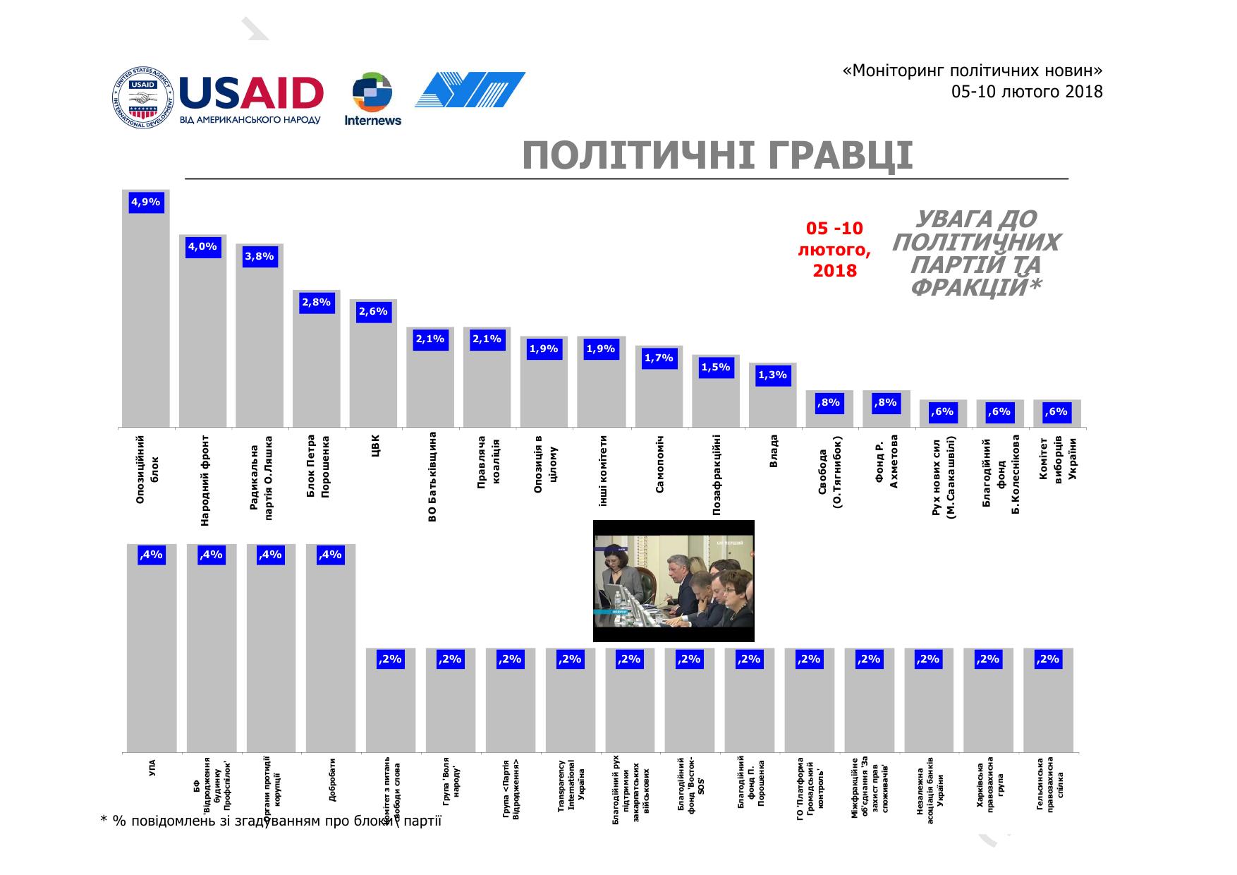 Також телеканали часто показували Андрія Парубія – 6% (у вересні 2017 – 4%, у травні 5%), Володимира Гройсмана – 6% (у вересні 2017 – 6%, у травні 8%, у лютому 7%).