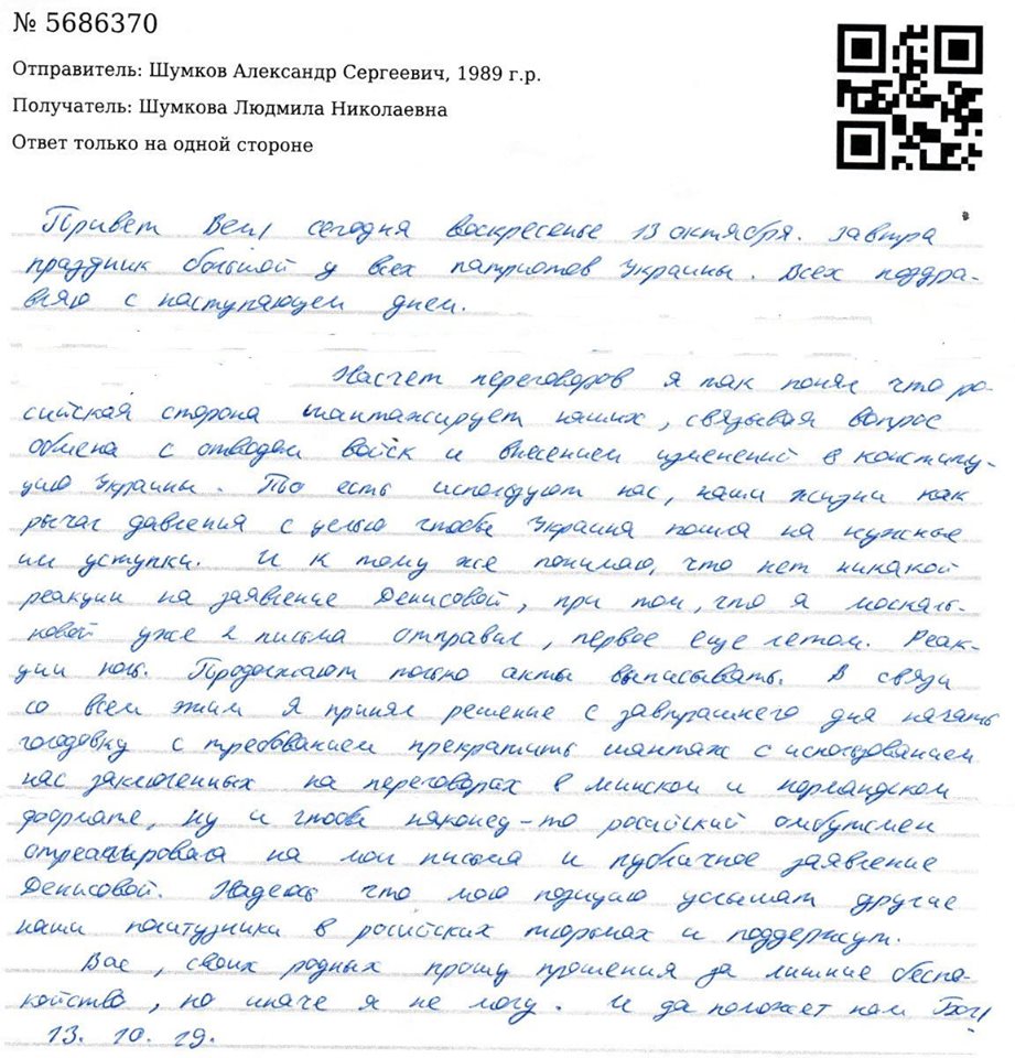 "Щодо перемовин я так зрозумів, що російська сторона шантажує наших, пов'язуючи питання обміну з відводом військ та внесенням змін до Конституції України. Тобто, використовує нас, наші життя як важіль тиску з метою щоб Україна пішла на необхідні їм поступки. У зв'язку зі всім цим я прийняв рішення з завтрашнього дня розпочати голодування", - пише він у листі від 13 жовтня.