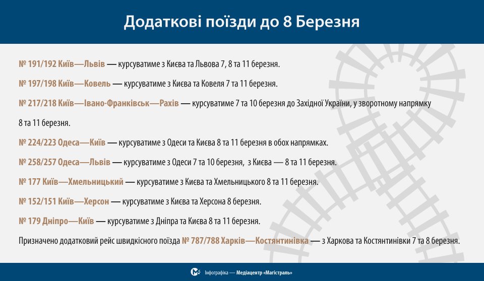 Поїзд № 191/192 Київ – Львів курсуватиме 7, 8 та 11 березня. З Києва відправлення о 08:03 та прибуття до Львова о 18:01. Зі Львова поїзд вирушить о 12:06 та прибуде до Києва о 21:36.