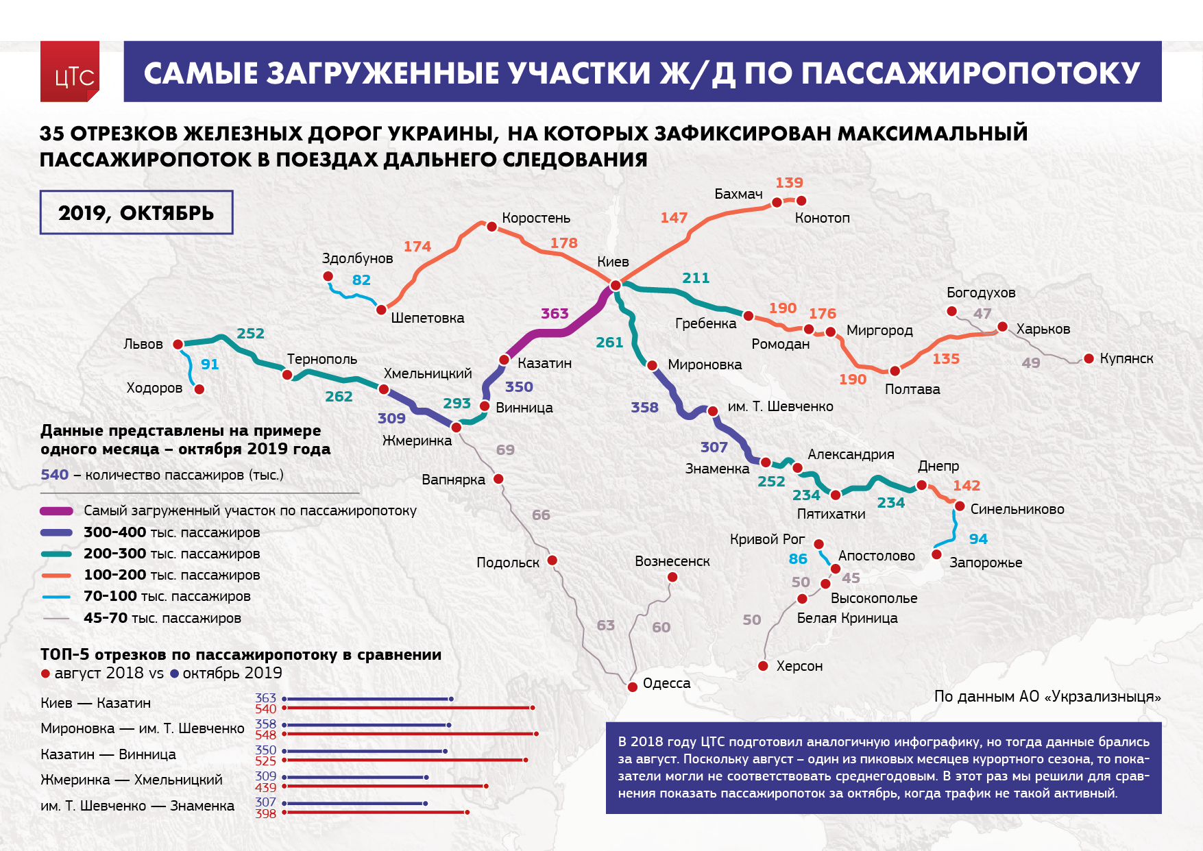 За даними інфографіки, найбільш завантаженими залізничними ділянками опинилися Київ-Козятин, Миронівка - їм.Шевченка, Козятин-Вінниця, Жмеринка-Хмельницький і їм.Шевченко - Знам'янка.